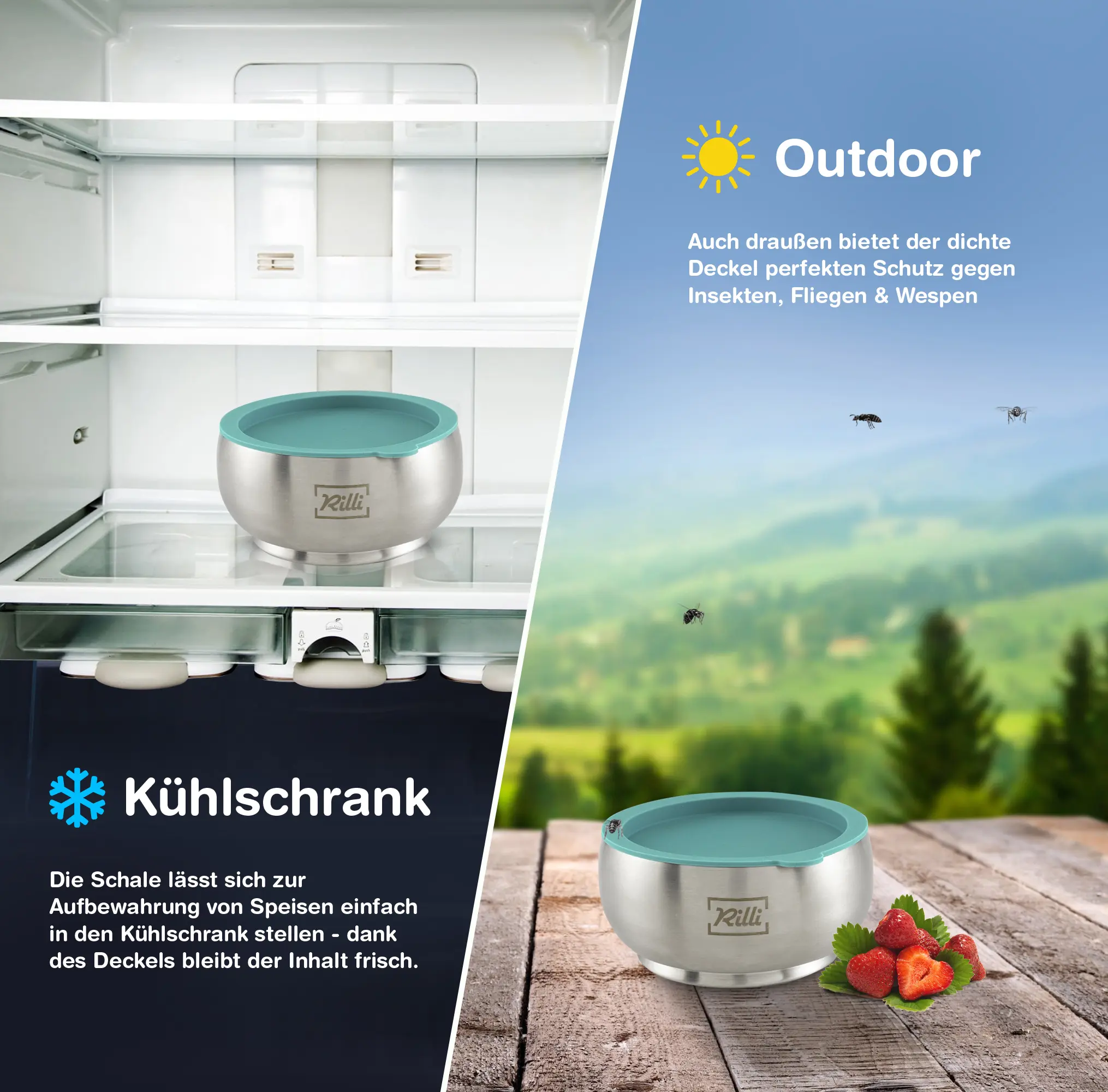 Doppelwandiger Edelstahl hält Speisen länger warm oder kalt.