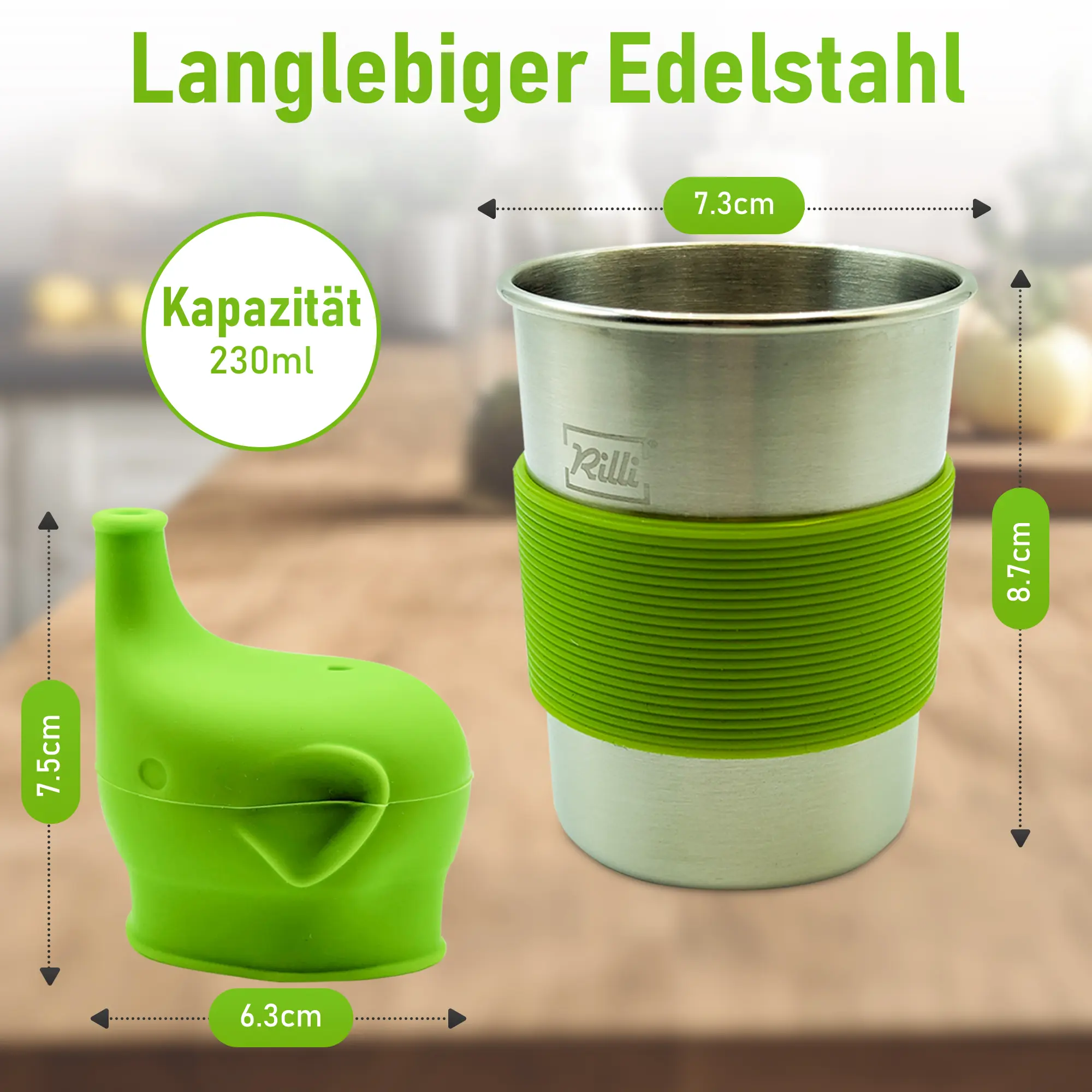Der Rilli Edelstahl Trinkbecher unterstützt Babys und Kleinkinder spielerisch beim Übergang von der Flasche zum Becher – sicher, praktisch und langlebig.