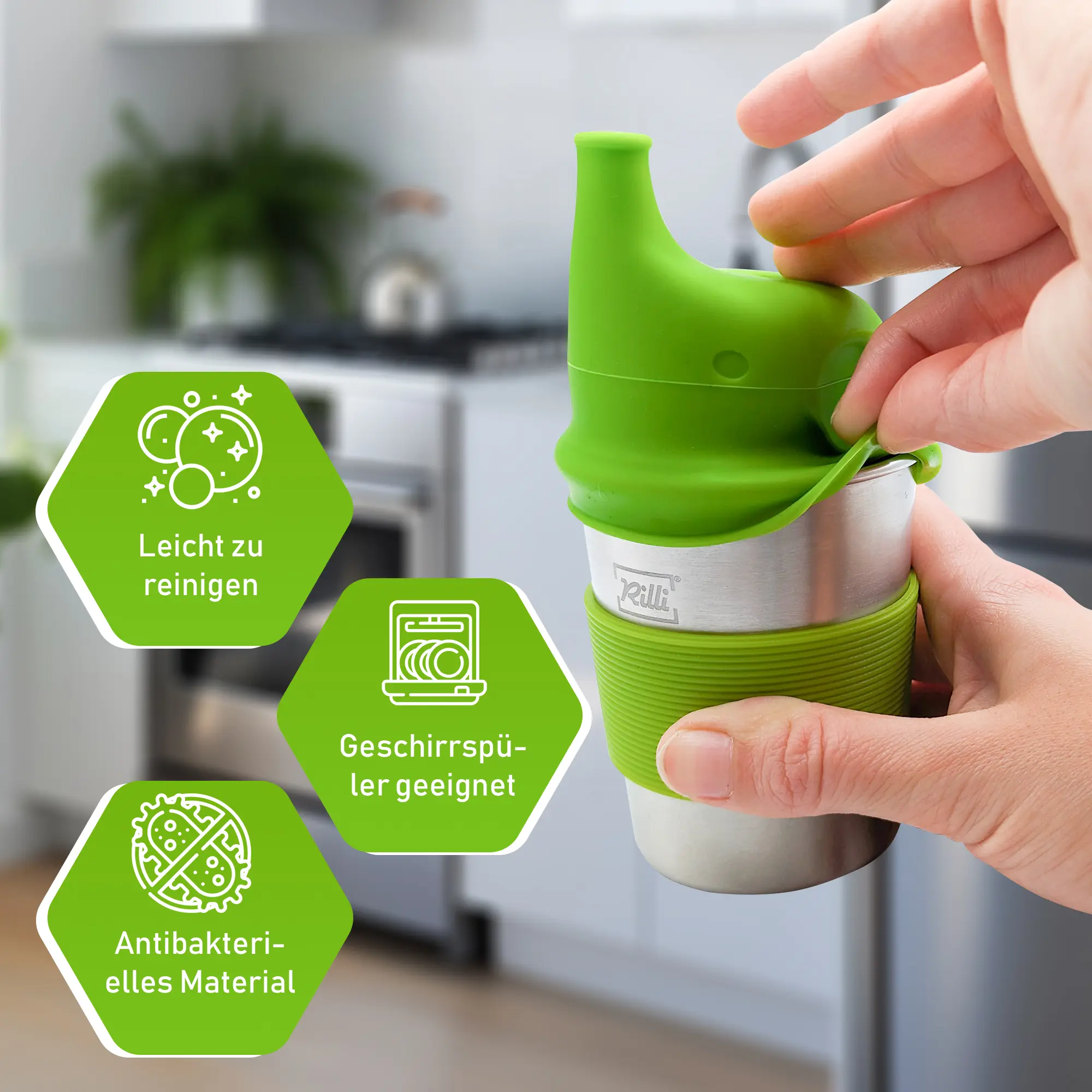 - Schnabeltassen-Aufsatz: Aus Silikon gefertigt und universell für andere Tassen, Gläser und Becher nutzbar.