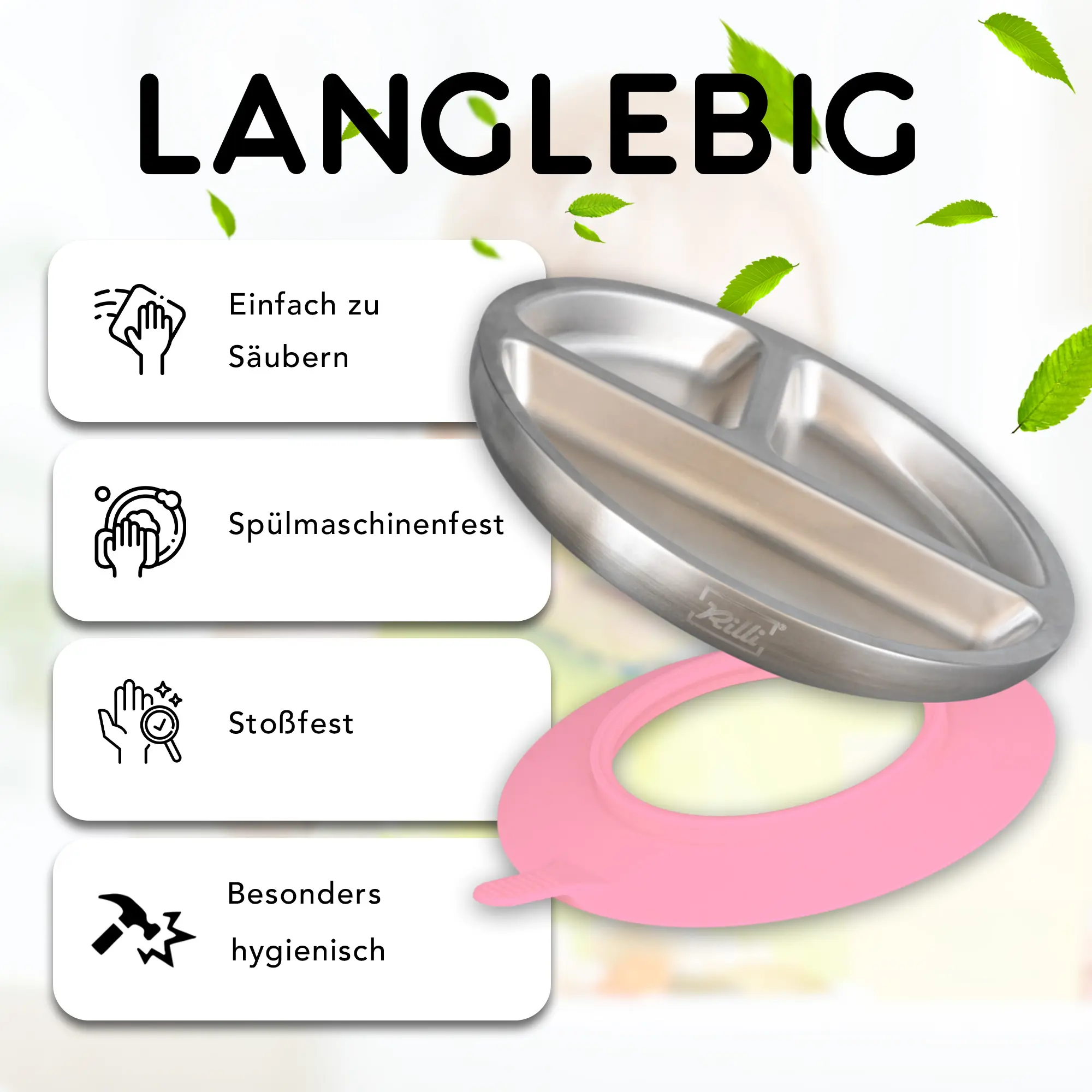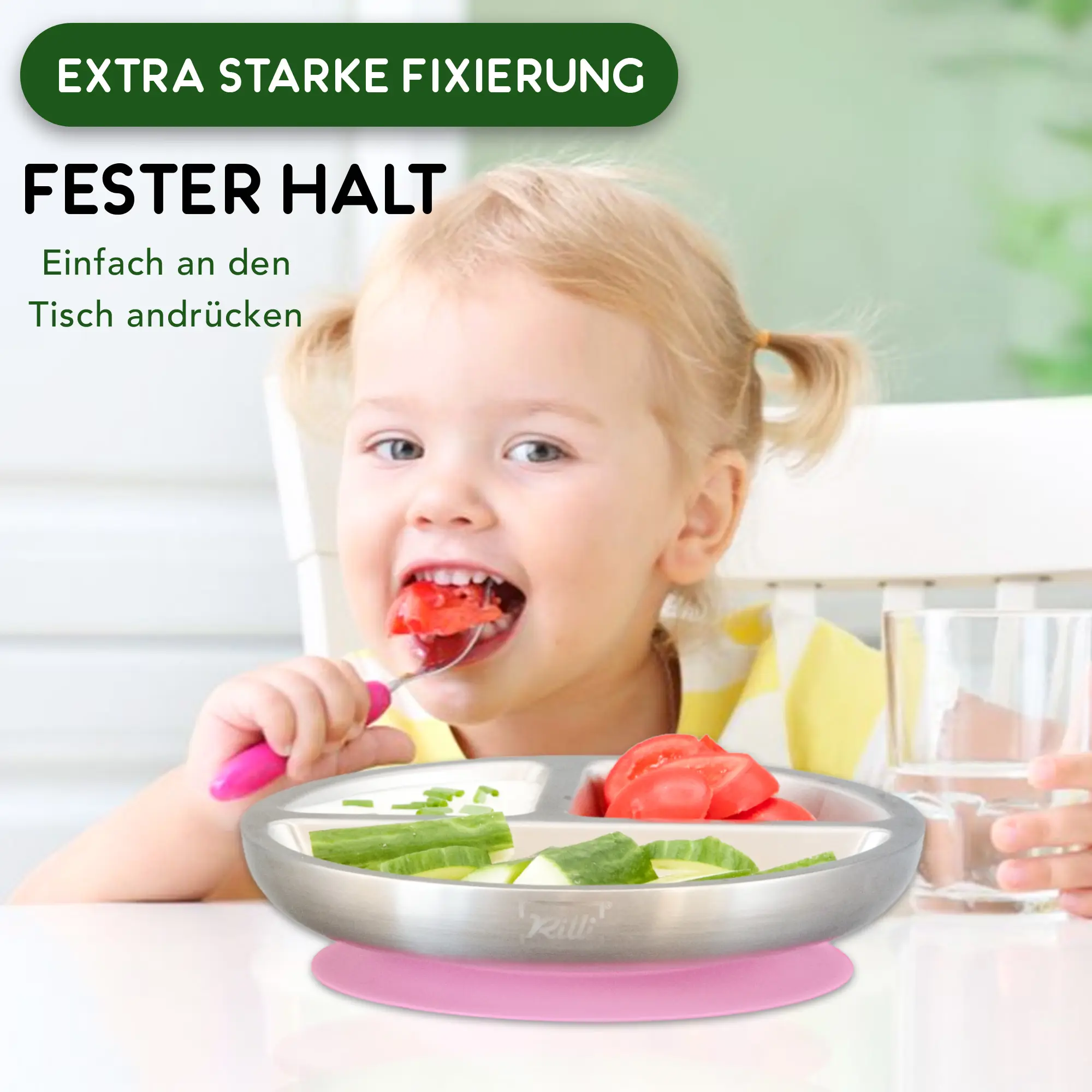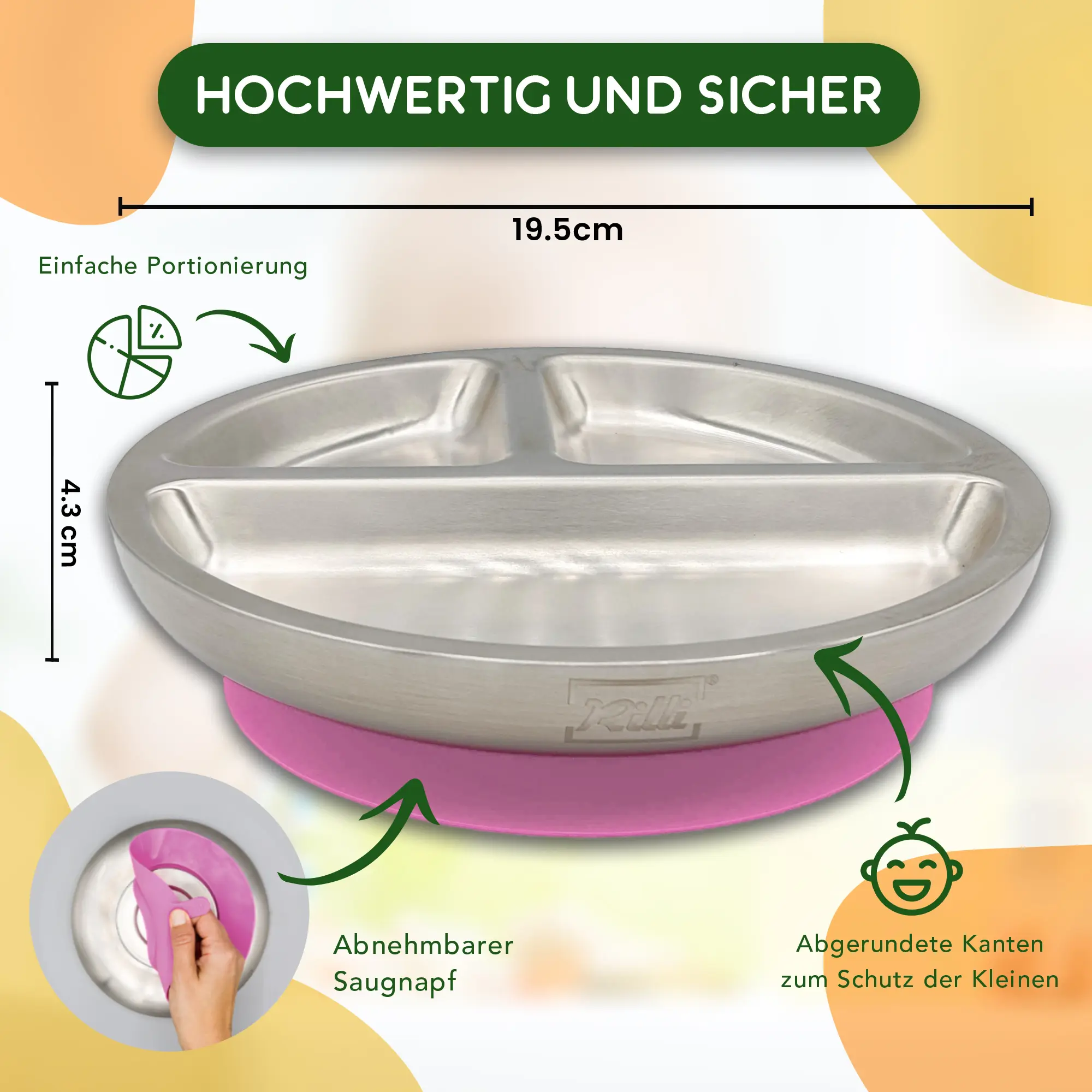Der Rilli Saugnapfteller macht BLW und Beikost entspannter – mit starkem Halt, Thermo-Funktion und hygienischem, geschmacksneutralem Edelstahl für sicheres Essenlernen.